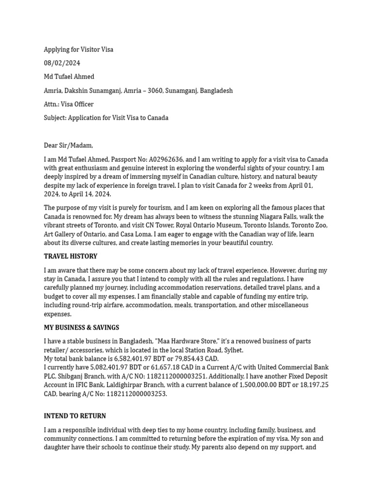 Cover Letter Canada PDF Travel Visa Toronto